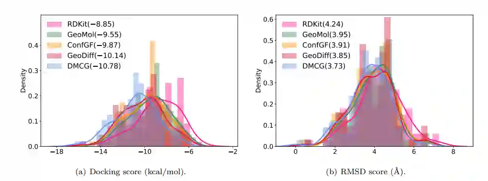 另外作者还将DMCG用在了分子对接(docking)的实验中。分子对接的第一步是获得配体小分子的3D构象,之后将其送入分子对接软件进行后续分析。通常人们会选择RDkit产生初始构象。这里,作者将构象生成这一步替换为采用深度学习工具,包括GeoMol, ConfGF, GeoDiff以及作者提出的DMCG。实验结果如图三所示。DMCG的初始构象能够获得更好的结合能,并且相对于真实的配体构象,DMCG的方法RMSD最小。同时我们也观察到,基于深度学习的方案效果,要好于基于RDKit的构象生成。