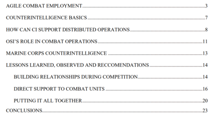 为了在分布式行动中取得成功,本文建议美空军特别调查办公室(OSI)反情报(CI)兵力必须尽量减少 "冷启动",在危机或冲突前的竞争阶段建立必要的关系;加强与将要支持的作战部队的联系;并为自己接受分布式作战模式。