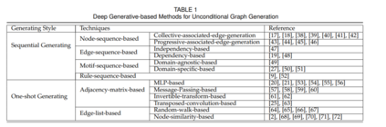 用于图生成的无条件深度生成模型无条件深度图生成的目的是通过深度生成模型从真实分布p(G)中抽样的一组观察到的真实图来学习分布pmodel(G)。根据生成过程的风格,我们可以将这些方法分为两个主要分支:(1)顺序生成:按顺序依次生成节点和边;(2)一次生成:根据矩阵表示建立一个概率图模型,一次生成所有节点和边。这两种生成图的方法各有优缺点。顺序生成虽然高效地执行了前一种生成的局部决策,但在保持长期依赖性方面存在困难。因此,图的一些全局属性(如无标度属性)很难包含进去。此外,现有的关于序列生成的工作仅限于预先定义的序列的顺序,从而留下了排列的作用。一次性生成方法可以通过多次迭代同步生成和细化整个图(即节点和边),从而对图的全局属性进行建模,但由于需要对节点之间的全局关系进行集体建模,其时间复杂度通常超过O(N2),因此大多数方法难以扩展到大型图。