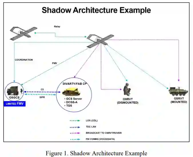 装备:为实现这一解决方案,建议配备的必要装备包括一个排的四个 "影子 "无人机系统/FTUAS 平台、两个通用控制系统、两个 "影子 "无人机系统/FTUAS 发射器、一个 TGS 和一个 GWS,以执行瞄准和 GE 传感器探测行动。影子无人机系统/FTUAS 平台、发射器和 GCS 必须在已建机场运行。根据 "影子 "无人机系统/FTUAS 排距离远程监视系统(LRS)的远近以及确定目标的位置,需要使用卫星地面数据终端(SGDT)和视线外(BLOS)操作。