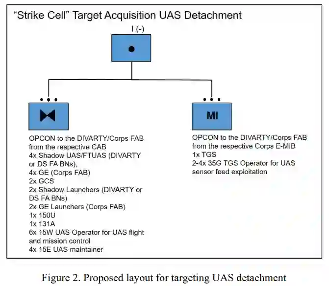 设计并指定一个 "打击单元 "目标获取无人机系统分遣队,该分遣队可成为分遣队和军团 FAB 的 OPCON: 这项建议可行、合适,不需要对人员配备或资源进行重大调整。为实现该建议,从各师 CAB 和支持军团的 CAB 向 DIVARTY 和军团 FAB 分配由四个 "影子 "无人机系统/FTUAS 平台组成的一个排,以及两个地面控制站 (GCS)、两个 "影子 "无人机系统/FTUAS 发射器和四至六个 15W 系列 "影子 "无人机系统/FTUAS 操作员,以便深入 DIVARTY 和军团 HPTs 进行瞄准、猎杀和塑造。为了促进和管理瞄准过程和必要的授权,师和军团的联合空地一体化中心(JAGIC)将通过位于分遣队和军团 FAB 指挥所的 131A 和 150U 负责无人机系统任务控制管理和目标起诉。这将确保在将设备和人员分配给分部和兵团 FAB 的同时,实现目标确定的优先顺序和流程,以满足指挥官的要求。为支持 "影子 "无人机系统/FTUAS 传感器馈送的瞄准和利用,应向分遣队和 FAB 分配一个战术地面站(TGS)、一个地理空间工作站(GWS)和 2 至 4 名来自军团远征军事情报旅(E-MIB)的 35G(图像情报分析员)。机体和相关设备的维护和后勤工作仍可由师支援区(DSA)和军团支援区(CSA)内的 "影子 "无人机系统/FTUAS 连人员管理。