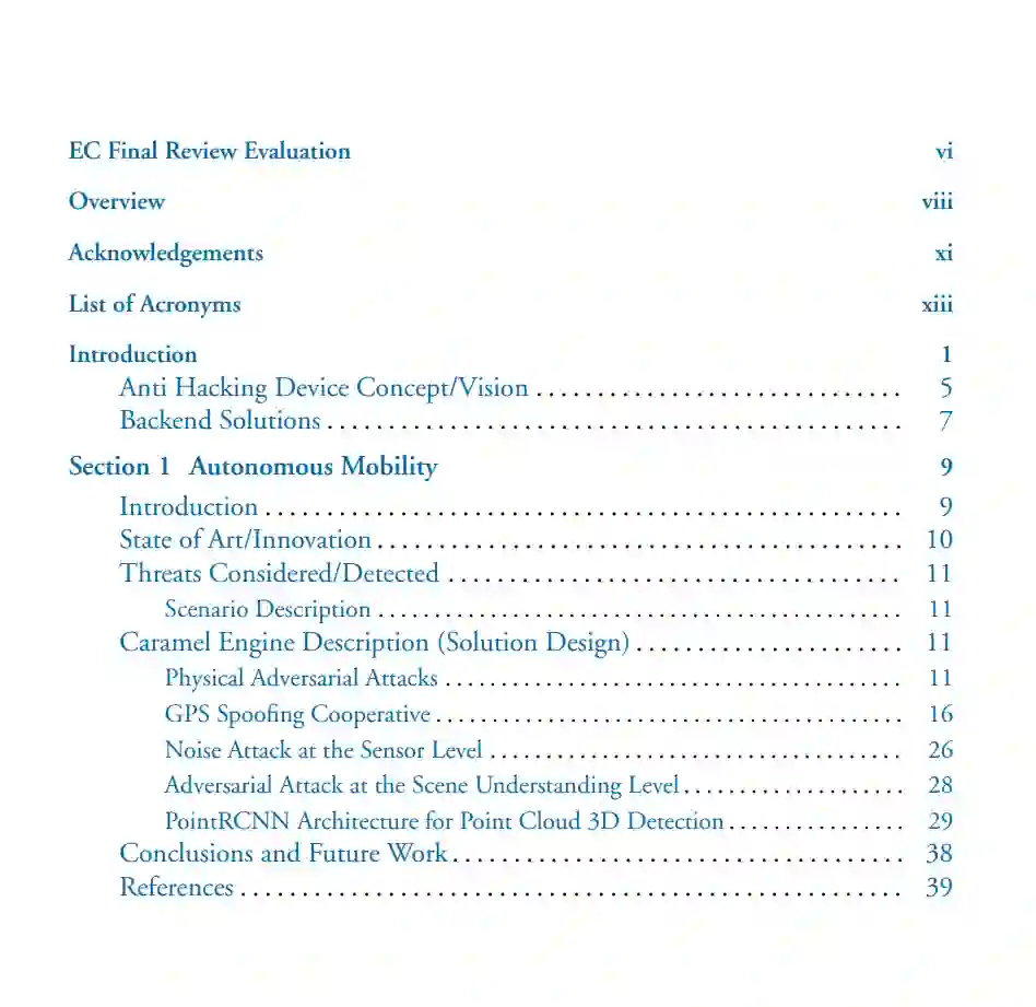 CARAMEL(基于人工智能的连接和自动驾驶汽车网络安全)是一个由欧洲联盟在地平线2020框架计划下共同资助的研究项目,是一个包括来自8个欧洲国家的15个组织以及3个韩国合作伙伴的项目联盟。该项目采用基于人工智能和机器学习技术的主动方法来检测和预防可能对自动驾驶和连接汽车的网络安全威胁。这种方法是基于四个基本支柱来解决的,即:自主移动、连接移动、电动移动和遥控车辆。本书从这些技术方向介绍了理论和成果。