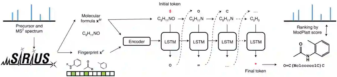 编译 | 蒋长志 今天给大家介绍来自苏黎世联邦理工学院和耶拿弗里德里希-席勒-耶拿大学团队发表在Nature Methods上的文章,文章提出了一种基于encoder-decoder神经网络的从质谱生成小分子结构的新方法:MSNovelist,它首先使用SIRIUS和CSI:FingerID来分别从质谱中预测出分子的指纹和表达式,然后将其输入到一个基于encoder-decoder的RNN模型来生成分子的SMILES。作者使用来自Global Natural Product Social Molecular Networking网站上的3863个质谱数据集进行评估,MSNovelist重现出了61%的分子结构,这些重现的分子结构都是未在训练集中见过的;并且使用CASMI2016数据集进行了评估,MSNovelist重现了64%的分子结构。最后,本文将MSNovelist应用在苔藓植物质谱数据集上进行验证,结果表明MSNovelist非常适合在分析物类别和新化合物表现不佳的情况下注释质谱对应的分子。