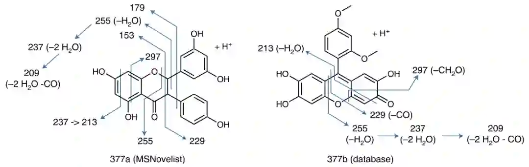4.3 案例分析 本文为了验证MSNovelist在预测新的分子化合物结构的的有效性,将其应用在9种苔藓植物的数据集中。已有研究表明苔藓植物会产生多种次生代谢物,但是尚未得到广泛的研究,这为发现天然产物提供了可能的机会。本文从MTBLS709数据库中提取了576个串联质谱,并使用SIRIUS工具来推断其分子式,然后使用MSNovelist模型来预测其分子结构,并和CSI:FingerID数据库搜索算法进行比较;MSNovelist模型在169个样本(75%的样本)中预测的结构得分都高于CSI:FingerID数据库搜索算法,对比结果如图3(a)。并且选取其中的一个多酚化合物(m/z为381.1020,分子式为C21H16O7)进行预测结果可视化分析,可视化结果如图4;从可视化结果可以看出,和CSI:FingerID相比,MSNovelist可以解释峰153和179,这说明MSNovelist可以更加有效的预测新的分子化合物。