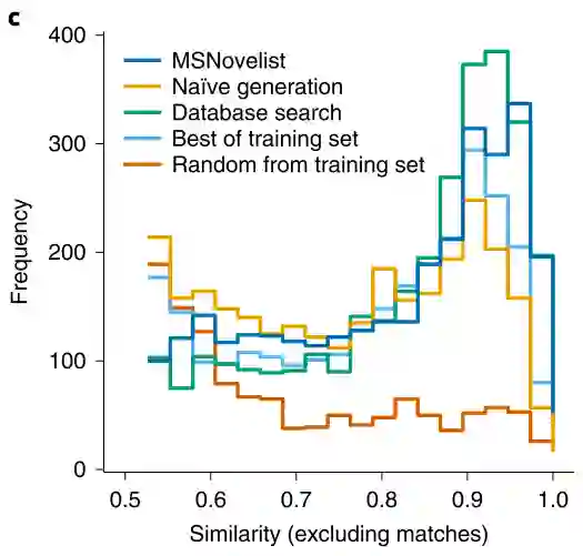 4.2 对比实验 本文为了验证MSNovelist模型的有效性,在3863个来自于GNPS数据库的质谱数据上和数据库搜索算法CSI:FingerID进行了比较,比较结果如图2(a)和(c);
