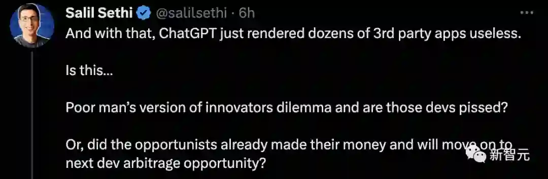 还有网友表示:「iOS版ChatGPT一出,一下子让几十个第三方应用程序失去了作用。这是不是...穷人版的创新者困境,那些开发者们生气了吗?或者,这些机会主义者已经赚到了钱,并将转向下一个开发套利机会?」