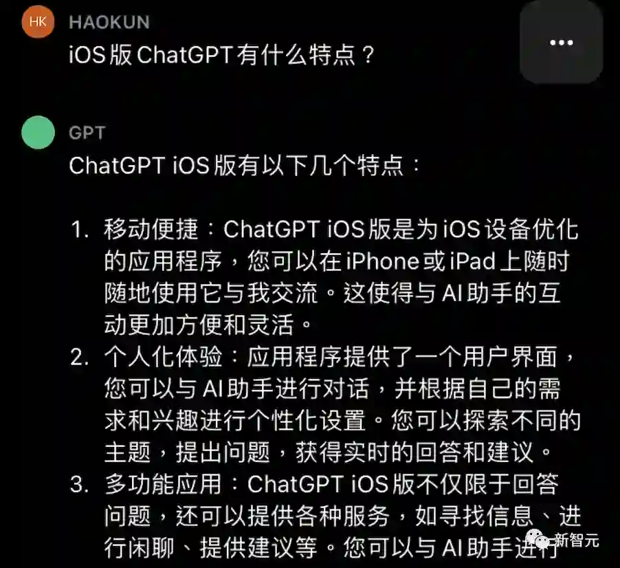 能在搜索引擎或浏览器之外的移动设备上直接访问ChatGPT,无疑具有革命性的意义。OpenAI此举,可能会创造又一个奇点,永远改变人们使用手机搜索和信息互联的方式。划重点——1. 应用程序免费2. 聊天记录同步3. 可以语音输入4. 响应速度更快5. 提前尝鲜功能6. (没有广告)所以,iOS版的ChatGPT和网页版究竟有何不同?话不多说,直接上手一探究竟。 速度更快,语音精准,使用限制不同步!