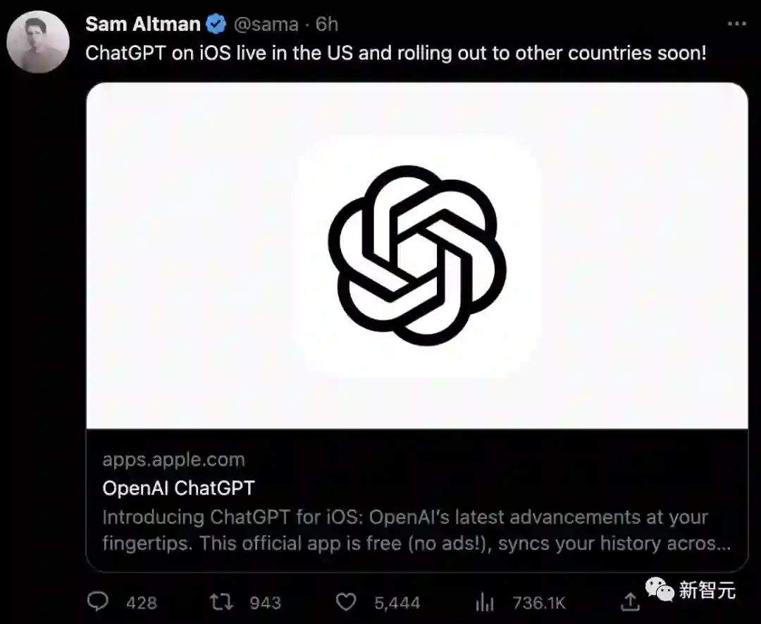 编辑:编辑部**【新智元导读】**ChatGPT破壳登录App Store,随时随地用,中文语音精准识别,真「iPhone时刻」来临! 一夜之间,OpenAI再放大招,ChatGPT官方应用上线!所有iPhone和iPad用户,已经可以从App Store下载ChatGPT了。不过,目前只能美区的用户可登录。安卓版用户也不要着急,已经在路上了。