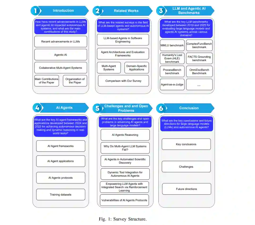 图1展示了本综述的结构安排。第二节介绍相关工作;第三节以表格形式比较当前LLM与Agentic AI的前沿评估基准;第四节系统回顾AI智能体框架、应用、协议与训练数据集;第五节聚焦关键研究方向;第六节为全文总结。