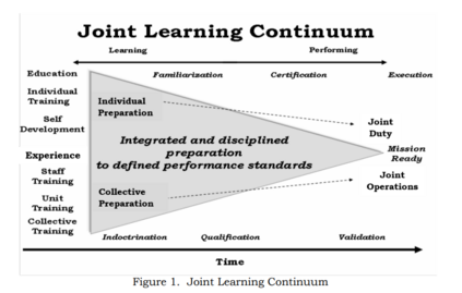 5.联合学习连续体。联合学习连续体的概念有助于联合部队的发展。联合学习连续体的重点是创造和保持合格的联合人员和联合领导人,能够有效地整合和同步国家能力,成功地实施国家安全和军事战略。