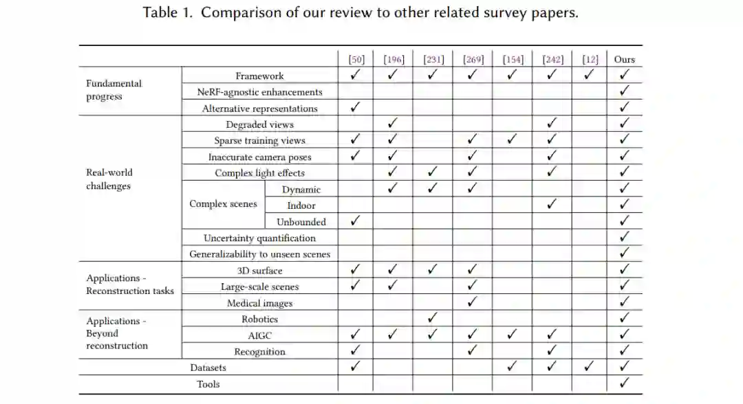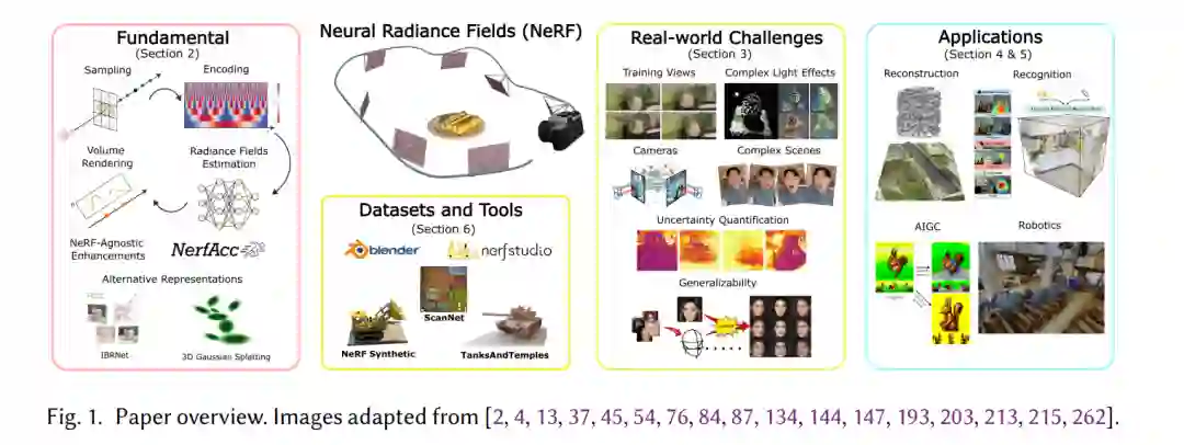 1 引言三维(3D)空间的感知和解释从根本上塑造了人类与物理世界的互动。使计算机视觉系统能够理解和处理现实世界中的3D信息,对于机器人技术、电子健康、沉浸式仿真等众多应用至关重要。一个具备3D能力的系统的关键组成部分是选择合适的3D基本元素来表示物体和场景。与作为2D图像统一表示的像素不同,3D表示有多种选择,例如体素、网格和点云。有效的3D表示必须保持精度和可扩展性,以便高效地表示3D世界,同时能够与深度学习框架和先进的3D视觉系统进行集成学习。传统的3D表示方法在满足这些计算要求方面存在显著的局限性。虽然体素和点云可以兼容基于深度学习的框架,但它们存在离散化伪影——体素面临可扩展性限制,而点云缺乏连接性——并且几何精度有限。网格在表示复杂几何形状方面表现优异;然而,它们的不规则拓扑和元素形状阻碍了与深度学习框架的集成。近年来的研究引入了隐式神经表示(INRs),以克服这些局限性。INRs通过神经网络参数化的连续隐式函数,实现了准确且内存高效的场景表示。早期的工作通过神经网络将3D坐标映射到有符号距离函数(SDFs)[142]或占据场[130]。然而,这些方法需要3D真值数据,这通常很难获取。虽然2D图像采集更为简单,但连接2D图像监督与3D INR优化之间依然存在一个基本挑战。神经辐射场(NeRF)[134]的引入通过仅依赖2D观测实现了有效的3D INR训练,极大地推动了这一领域的发展。NeRF引入了一个优雅的框架,用于学习具有连续体积函数的3D场景,该函数将3D位置和视角方向映射到RGB颜色和密度。通过体积渲染[80],NeRF仅从2D图像及其对应的相机姿态中重建3D场景,从而实现了高保真度、逼真的新视角合成。自2020年引入以来,NeRF在计算机图形学和3D视觉领域引起了广泛的研究关注。基础性工作已经增强了NeRF模型的效率和精度,解决了复杂现实世界场景中的挑战,同时涌现出众多应用,推动了各类3D视觉任务的发展。随着成千上万篇与NeRF相关的最新研究,针对这一主题的全面综述变得迫切且至关重要。1.1 我们的贡献目前已有一些与NeRF相关的综述论文[12, 50, 154, 242, 269],它们部分涵盖了NeRF的研究主题,或并未完全更新。例如,大多数综述主要集中在解决复杂现实世界挑战的几个方面,而[196, 231]虽包含了NeRF相关的研究,但其关注的主题更为广泛——神经渲染[196]和神经场[231],因此仅部分涵盖了NeRF相关的研究内容。表1总结了这些局限性。我们的综述填补了这一空白,全面覆盖了从基础改进到实际应用的NeRF相关进展(如表1所示),帮助读者识别关键的研究方向,找到解决特定挑战的合适方案,并为社区提供宝贵的见解。本综述首先深入概述了NeRF相关的基础性进展,接着总结了基于NeRF框架的近期替代表示方法。然后,我们详细识别了可能影响NeRF在现实世界应用中鲁棒性和泛化能力的潜在挑战。此外,我们探讨了各种重建任务——这些任务对于评估场景表示至关重要——并进一步研究了NeRF作为计算机视觉和机器人技术的基本构建块的潜力。为了进一步支持该领域的研究,我们提供了广泛收集的常用数据集和工具,向研究人员提供有价值的资源。最后,我们强调了NeRF相关研究中的现有研究空白和关键开放挑战,旨在激励社区进一步改进NeRF模型,并将其作为强大的3D表示工具,推动各类视觉任务的发展。1.2 组织结构本综述的范围如图1所示,文章结构如下:第二部分提供了NeRF的概述,并深入回顾了提升渲染质量和效率的不同基础性改进策略,随后在第2.6节简要介绍了替代表示方法。第三部分则深入分析了各种潜在的现实世界挑战,并为每个方面提供了相应的解决方案。我们探讨了包括重建(第4节)、机器人技术(第5.1节)、识别(第5.2节)和人工智能生成内容(AIGC)(第5.3节)在内的各种NeRF应用任务。此外,第6节汇总了常用工具和数据集。最后,第7节讨论了NeRF研究中的开放挑战和关键研究方向。