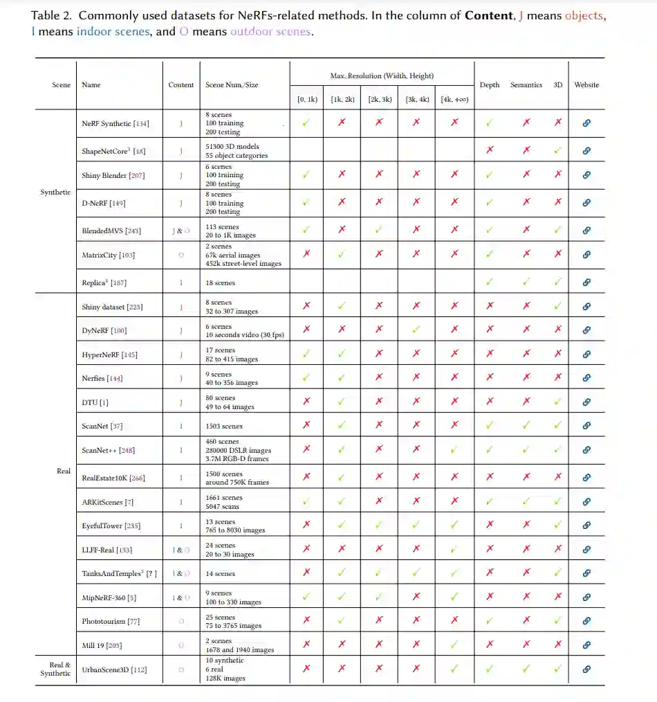 本调查报告回顾了关键的NeRF相关进展,以提高表示3D场景的准确性和效率,并探讨了其在现实世界问题中的适用性。我们涵盖了增强渲染质量和效率的策略,分析了解决现实世界挑战的方案,并探讨了在重建、AIGC、识别和机器人等领域的应用。最后,我们编制了常用的数据集和有用工具的列表。在本节中,我们退后一步,探讨了未来推进NeRF的开放挑战。当前的NeRF增强在高达1K分辨率的图像上产生了令人印象深刻的结果。然而,当处理更高分辨率(如4K)时,渲染时间比1K图像增加了一个数量级,限制了广泛采用。廉价移动设备的兴起,能够获取高分辨率图像但计算资源有限,突显了优化NeRF以提高效率和紧凑性的必要性,同时最小化GPU需求。随着NeRF性能的不断提高,重新审视测试集的选择和评估指标至关重要。当前的评估严重依赖于参考2D图像,使其对测试相机分布、测试视图质量和场景遮挡敏感。