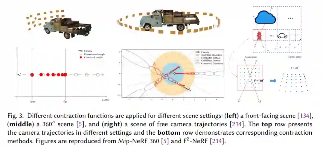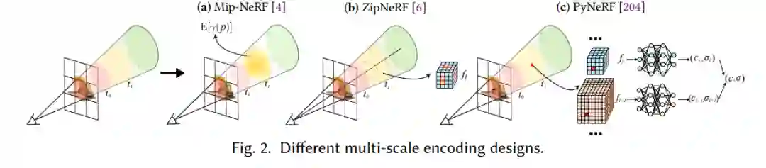 2.3 编码标准编码(公式2)平等对待每个频率信号,导致在不同分辨率下渲染时出现问题。高频位置编码特征可能会产生混叠,导致称为“锯齿”的伪影。此外,深度网络直接从编码的输入坐标处理辐射场,这需要大型且计算成本高昂的多层感知器(MLP)来准确表示场景。 2.4 辐射场估计辐射场估计的进展朝着更高的渲染质量、更快的训练和渲染速度以及更紧凑的模型发展。在本小节中,我们将讨论提高效率和紧凑性的四种主流技术。