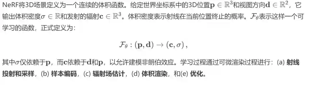 2.5 体积渲染经典的体积渲染假设3D空间充满了可以吸收、发射和散射光的粒子,沿时间参数化的射线积分辐射。NeRF通过仅考虑吸收和发射简化了这一框架,使用体积渲染方程(公式3)作为其自监督训练的基石成分。