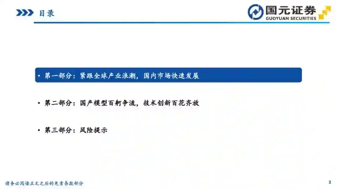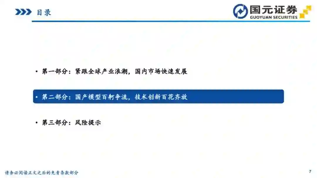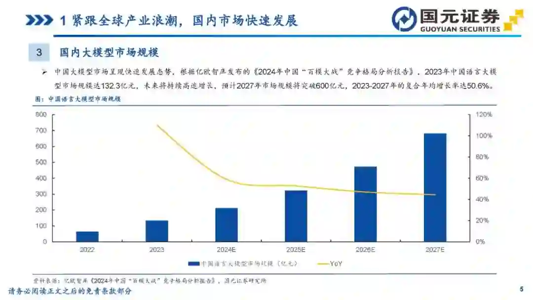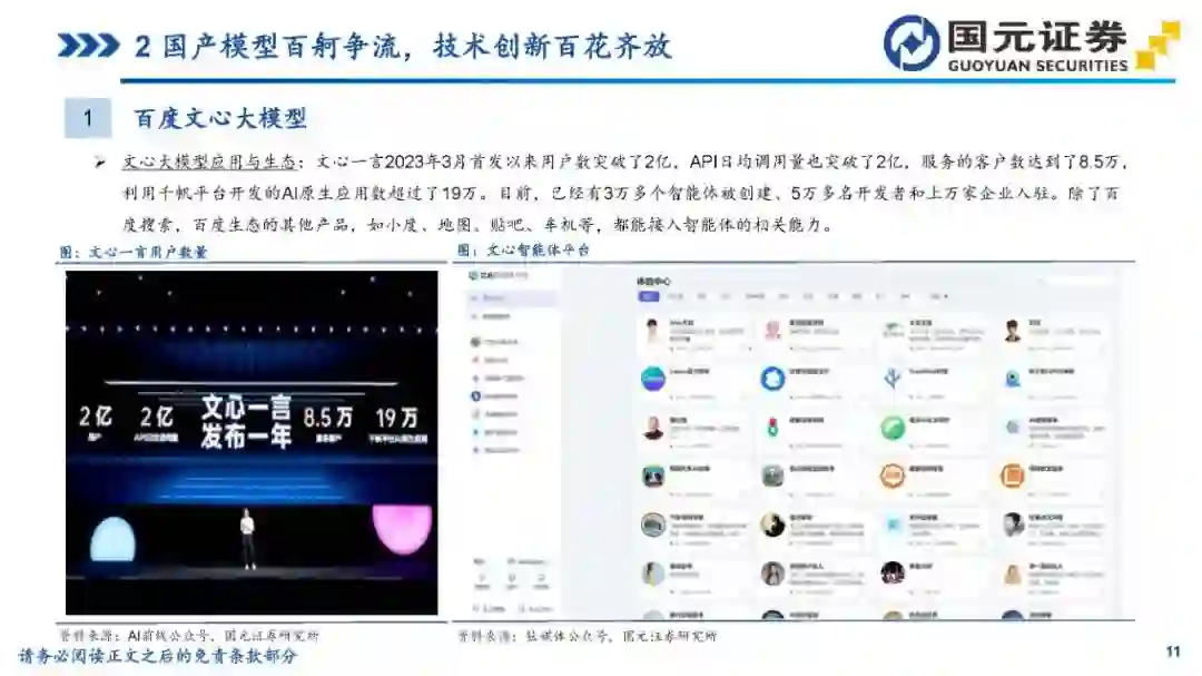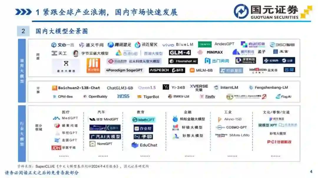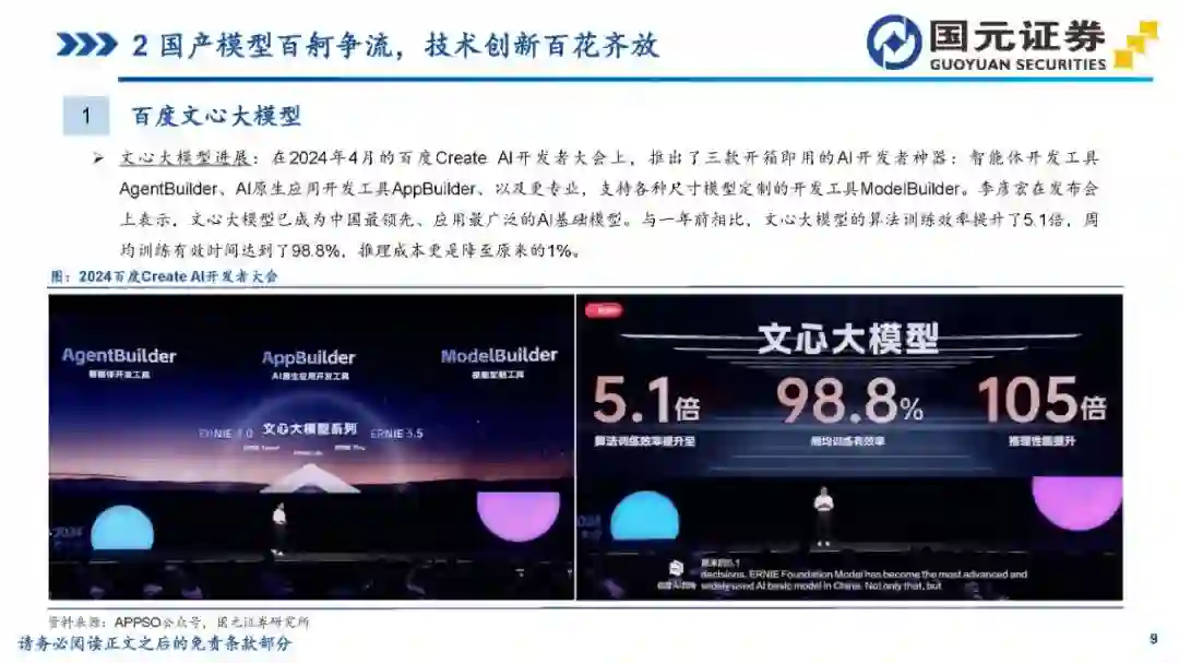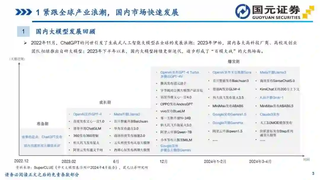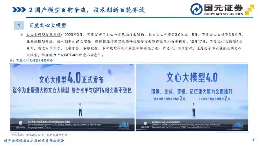 目录 第一部分:紧跟全球产业浪潮,国内市场快速发展 第二部分:国产模型百舸争流,技术创新百花齐放 第三部分:风险提示 1紧跟全球产业浪潮,国内市场快速发展 1国内大模型发展回顾 2022年11月,ChatGPT的问世引发了生成式人工智能大模型在全球的发展浪潮;2023年伊始,国内各大高科技厂商、高校及创业团队相继推出自研大模型;2023年下半年以来,国内大模型持续更新迭代,逐步形成了“百模大战”的火热场面。 3国内大模型市场规模 中国大模型市场呈现快速发展态势,根据亿欧智库发布的《2024年中国“百模大战”竞争格局分析报告》,2023年中国语言大模型市场规模达132.3亿元,未来将持续高速增长,预计2027年市场规模将突破600亿元,2023-2027年的复合年均增长率达50.6%。 4国内大模型产品最新访问量概况 根据AI产品榜公众号的数据,2024年3-4月,百度旗下文心一言和百度文库AI功能访问量居前;Kimi(Moonshot)增长势头迅猛,连续两个月访问量快速增长,排名第二;秘塔AI搜索、360AI搜索等搜索类产品也表现出色。整体来看,访问量数据反映了中国AI大模型市场的活跃度和用户对这些技术的高度兴趣。 2国产模型百舸争流,技术创新百花齐放 1百度文心大模型 文心大模型发展历程:2023年3月,百度发布了文心一言基础技术架构,推出文心大模型3.0版本;5月,百度文心大模型3.5发布,在基础模型升级、技术创新知识点增强、逻辑推理增强以及插件机制等方面取得效果和效率提升。10月17日,百度文心大模型4.0发布,通过万卡算力、飞桨平台、多维数据、多阶段对齐及可再生训练实现了进一步迭代。李彦宏称,这是迄今为止最强大的文心大模型,综合能力“与GPT-4相比毫不逊色”。 1百度文心大模型 文心大模型进展:在2024年4月的百度CreateAI开发者大会上,推出了三款开箱即用的AI开发者神器:智能体开发工具AgentBuilder、AI原生应用开发工具AppBuilder、以及更专业,支持各种尺寸模型定制的开发工具ModelBuilder。李彦宏在发布会上表示,文心大模型已成为中国最领先、应用最广泛的AI基础模型。与一年前相比,文心大模型的算法训练效率提升了5.1倍,周均训练有效时间达到了98.8%,推理成本更是降至原来的1%。