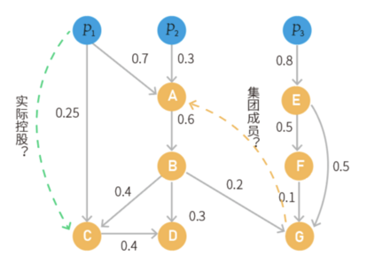 如图 6 所示,通过计算持股比例,判断个人节点 **P1 **是否实际控制了公司节点 **C **?需要判断一家公司或者一个人是否通过多数的股权比例对另一家公司形成控制权,即公司实际控制人的发现问题。
