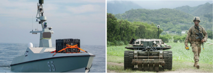 陆战中的 MUM-T: 在地面上,有人无人协同作战(MUM-T)通过将人类操作的地面部队与无人地面车辆(UGV)和空中无人机整合在一起,改变了陆战。配备传感器和摄像头的 UGV 可进行先进的侦察和监视,为人类操作员提供实时数据。在城市环境或特种作战中,MUM-T 可确保在复杂地形中有效导航,最大限度地降低人类的风险。士兵与自主系统之间的协作增强了对态势的感知和决策能力。陆战中的 MUM-T 还可延伸到后勤支持,UGV 可协助执行补给/再补给任务,优化军事行动的效率。为了证明这一点,"UGV 实验 "中的步兵排仅携带个人武器和弹药进行了一次 ANE 藏身处清理演习。在自主模式下,UGV 跟随纵队取走了背包和补给品。