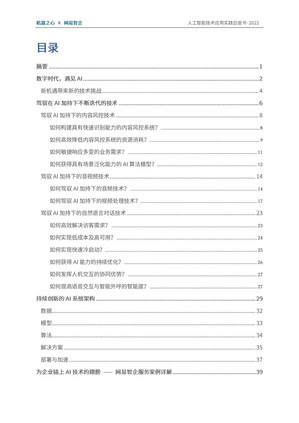 本报告将从AI技术和行业应用角度,通过对网易智企AlI技术团队的方案进行深入解读,透视网易智企如何在工业实践中驾驭AI技术,实现内容风控、音视频及自然语言对话三个领域技术的持续迭代,尝试为现代企业在Al时代进行业务创新,开展企业数字化转型提供有效参考。