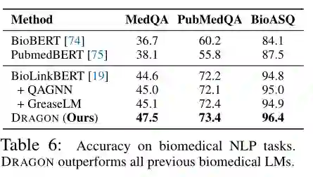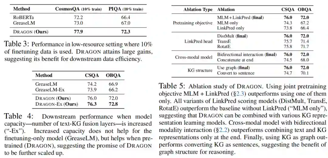 数据有限的下游任务。在表1中,作者发现DRAGON在下游任务中比GreaseLM提供了显著的提升,但可用的微调数据有限,例如ARC (3K训练实例;+4%的精度增益),谜语(3K实例;+4%精度)和OBQA (5K实例;+ 5%的准确率)。对于其他任务,作者也在低资源设置下进行了实验,其中使用了10%的微调数据(表3)。在这里,可以看到DRAGON比GreaseLM获得了显著的增益(PIQA上+5%的精度),这表明DRAGON提高了数据效率。