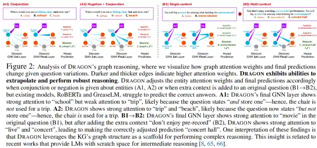 定性分析。使用CSQA数据集,作者进一步对DRAGON的KG推理组件的行为进行了案例研究,其中作者可视化了在不同问题变化下图注意权重的变化(图2)。发现DRAGON展示了推断和执行鲁棒推理的能力。由于这些问题比通常在CSQA训练集中看到的问题更复杂,作者的见解是,当普通LM(RoBERTa)和微调(GreaseLM) 在学习复杂推理方面有局限性时,kg增强的预训练(DRAGON)有助于获得可推广的推理能力,从而推断到更难的测试示例。