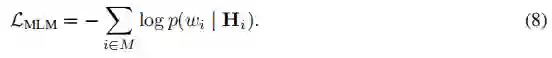 屏蔽语言模型(MLM)。作者用一个特殊的标记[MASK]屏蔽输入文本中的标记子集,并让任务头是一个线性层,从编码器中获取上下文化的标记向量{}来预测原始标记。目标是交叉熵损失: