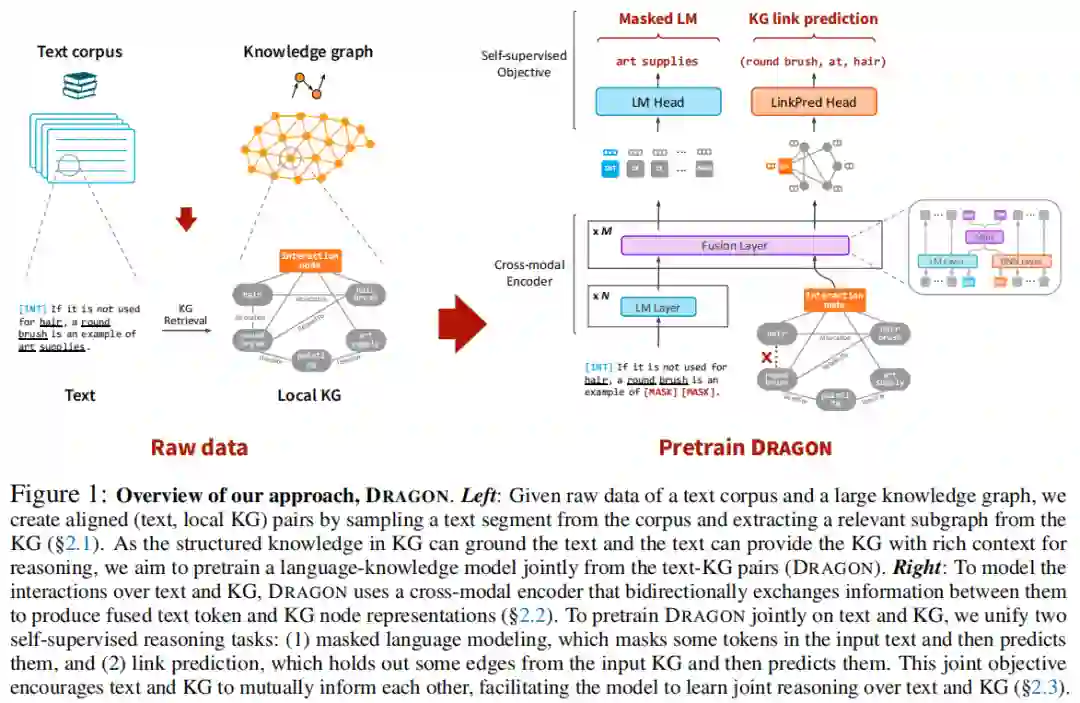 作者提出DRAGON,一种对文本和KG的语言知识模型进行深度双向、自监督的预训练的方法。具体来说,如图1所示,作者将一个文本语料库和一个大型知识图作为原始数据,并通过抽样粗对齐(文本段,局部KG)对(§2.1)为模型创建输入实例。为了学习文本和KG的相互作用,DRAGON由一个双向融合输入文本-KG对的跨模态编码器(GreaseLM)和一个对文本-KG输入进行双向自监督的预训练目标(§2.3)组成。作者的预训练目标将掩蔽语言建模(MLM)和KG链接预测(LinkPred)相结合,使文本和KG相互通知,并学习联合推理。最后,作者描述了如何为下游任务调整预先训练的DRAGON模型。虽然作者方法的每个单独部分(GreaseLM, MLM, LinkPred)本身并不新鲜,但作者是第一个将它们有效地结合在一起的人,并证明了所得到的模型具有强大的经验结果。