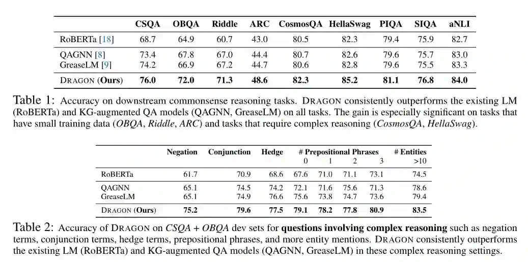 表1显示了9个下游常识推理任务的性能。在所有任务中,DRAGON始终优于现有的LM (RoBERTa)和KG-augmented QA模型(QAGNN, GreaseLM),例如,在RoBERTa上,绝对精度提高了7%,在OBQA上,比GreaseLM提高了5%。这些准确性的提高表明DRAGON相对于RoBERTa (KG推理)和GreaseLM(预训练)的优势。对于具有少量训练数据的数据集(如ARC、Riddle和OBQA),以及需要复杂推理的数据集(如CosmosQA和HellaSwag),这种增益尤其显著,作者将在以下部分详细分析这些数据集。