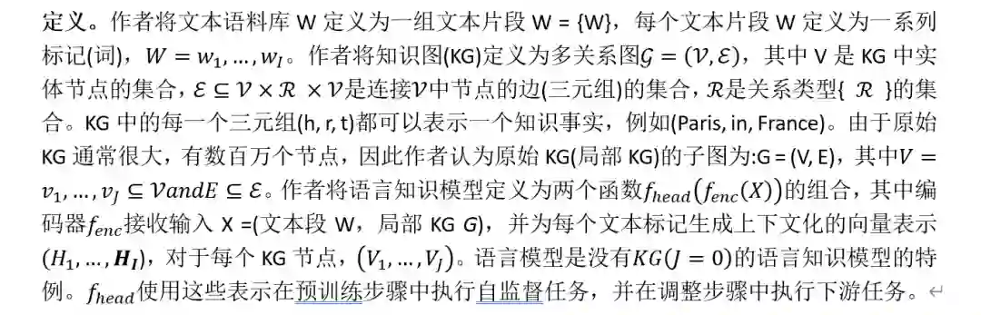 给定一个文本语料库W和一个较大的知识图G,作者通过准备(文本段W,局部知识图谱 G)对来为模型创建输入实例。作者希望每对文本的文本和KG(大致)语义对齐,以便文本和KG可以相互告知,并促进模型学习两种模式之间的交互推理。