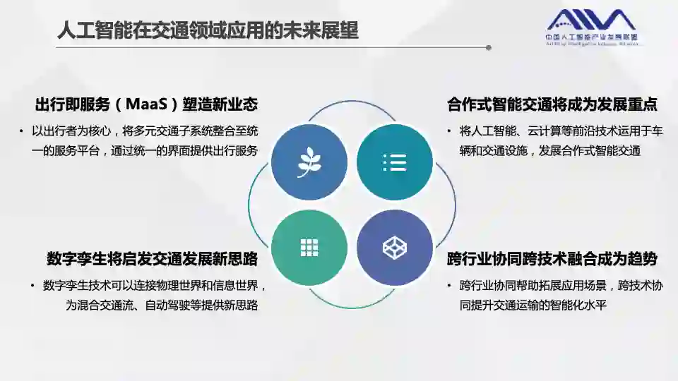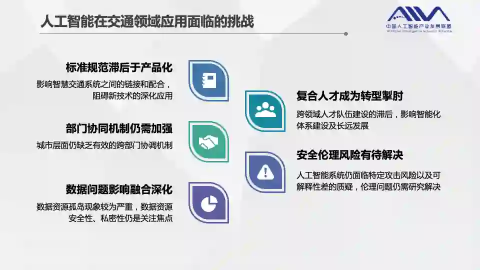 (一)标准规范滞后于产品化 (二)部门协同机制仍需加强 (三)数据问题影响融合深化 (四)复合人才成为转型掣肘 (五)安全伦理风险有待解决 四、人工智能在交通领域应用的未来展望