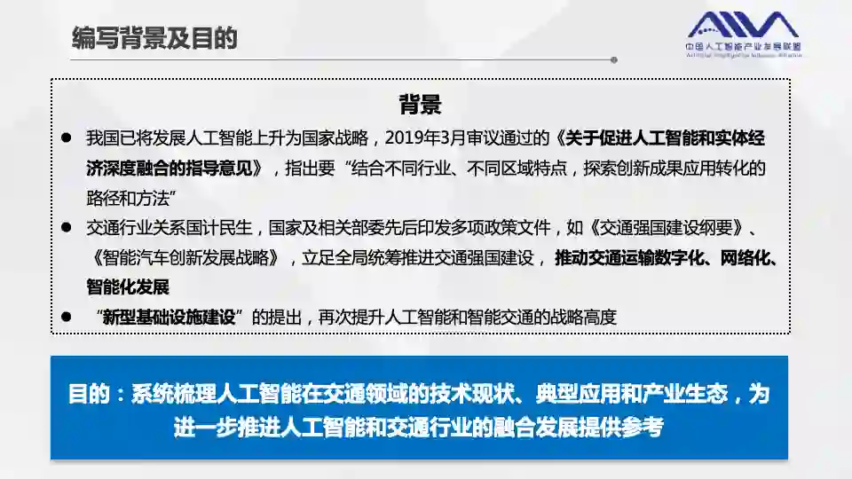 2020年国家正式提出新型基础设施建设,将人工智能纳入新技术基础设施范畴,智能交通基础设施纳入融合基础设施范畴,其建设和推进均成为产业焦点,如何充分发挥人工智能的赋能作用,加快交通的数字化智能化发展,推动人工智能和交通的融合应用,成为产学研用的重要课题,也是本报告撰写的主要背景。