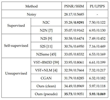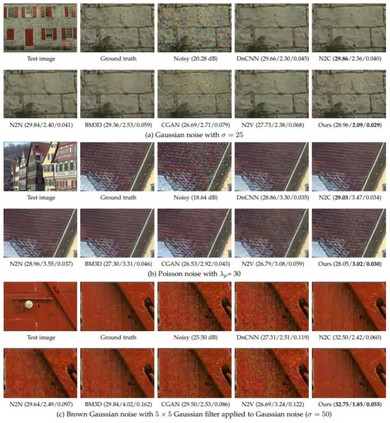 首先是仿真噪声去除实验,所测试的合成噪声类型包括加性高斯噪声、泊松噪声和布朗高斯噪声,其中布朗高斯噪声是使用一个核大小为5*5的高斯滤波器过滤标准差为50的高斯噪声得到的。使用了BSDS500作为训练数据集,KODAK24作为测试数据集,表1和表2分别为失真度量和感知质量测试结果,对于空间独立的高斯噪声和泊松噪声,所提出方法比监督学习方法PSNR低1dB左右,而在空间相关的布朗高斯噪声中,所提出方法取得了最佳的PSNR,此外在所有噪声中,所提出方法均获得了最佳的PI/LPIPS分数,这表明其可以得到最佳的感知质量。如图5所示,所提出方法比DnCNN、N2C、N2N、N2V和BM3D具有更好的感知质量,因为它保留了更多的细节信息。