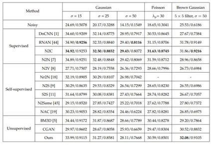 本节中使用WGAN-gp对所提出准则进行实现,其中生成器结构如图3所示,鉴别器结构如图4所示。其中生成器主体结构为U-Net架构,它由编码器中的两个下采样CNN层和解码器中的两个上采样CNN层组成。残差通道注意力模块(RCAB)被用于每个下采样和上采样层来增强网络的生成能力。我们在仿真RGB图像、仿真深度图像、真实显微镜图像、真实手机摄影图像、真实深度图像和真实原始深度图像上均进行了实验测试,并与当前最佳的一些监督学习、自监督和无监督学习方法进行了对比,此处因篇幅限制仅挑选部分进行展示,具体内容可参考原论文。 测试中使用了PSNR和SSIM作为失真度量指标,Perception Index (PI)和Learned Perceptual Image Patch Similarity (LPIPS)作为感知质量指标。