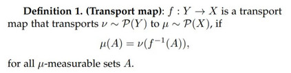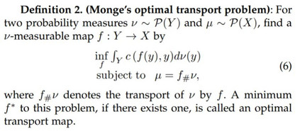 最优传输问题旨在找到将一种质量分布转换为另一种质量分布的最有效传输映射,同时最小化传输成本,其在信号处理、图像处理和机器学习中有着广泛的应用。 假设 和 是 和 上的两组概率测度,设 是一个代价函数,衡量将 传输到 的代价。最优传输问题的目标就是寻找将 传输到 代价最小的传输映射。 其中传输映射(transport map)的定义如下: