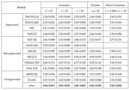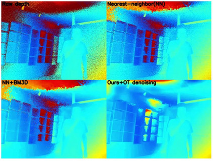 最近,深度相机变得越来越流行,而由于成像机理的不同,深度图像的噪声比RGB图像大得多。此外,由于场景中对象的反射率和透明度较低,深度图像中通常存在空洞(无效像素)。该实验中使用了一台ToF深度相机采集了1430张原始深度图像作为训练和测试集,并使用仿真的SUNCG数据集作为参考的干净图像。图7展示了重建结果的视觉比较,所提出方法可以取得最佳的去噪结果。