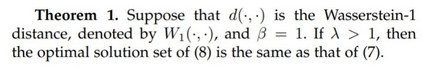 虽然进行了松弛,本文证明了:当 为 Wasserstein-1 距离,且 时,问题 和 有相同的最优解,具体定理如下: