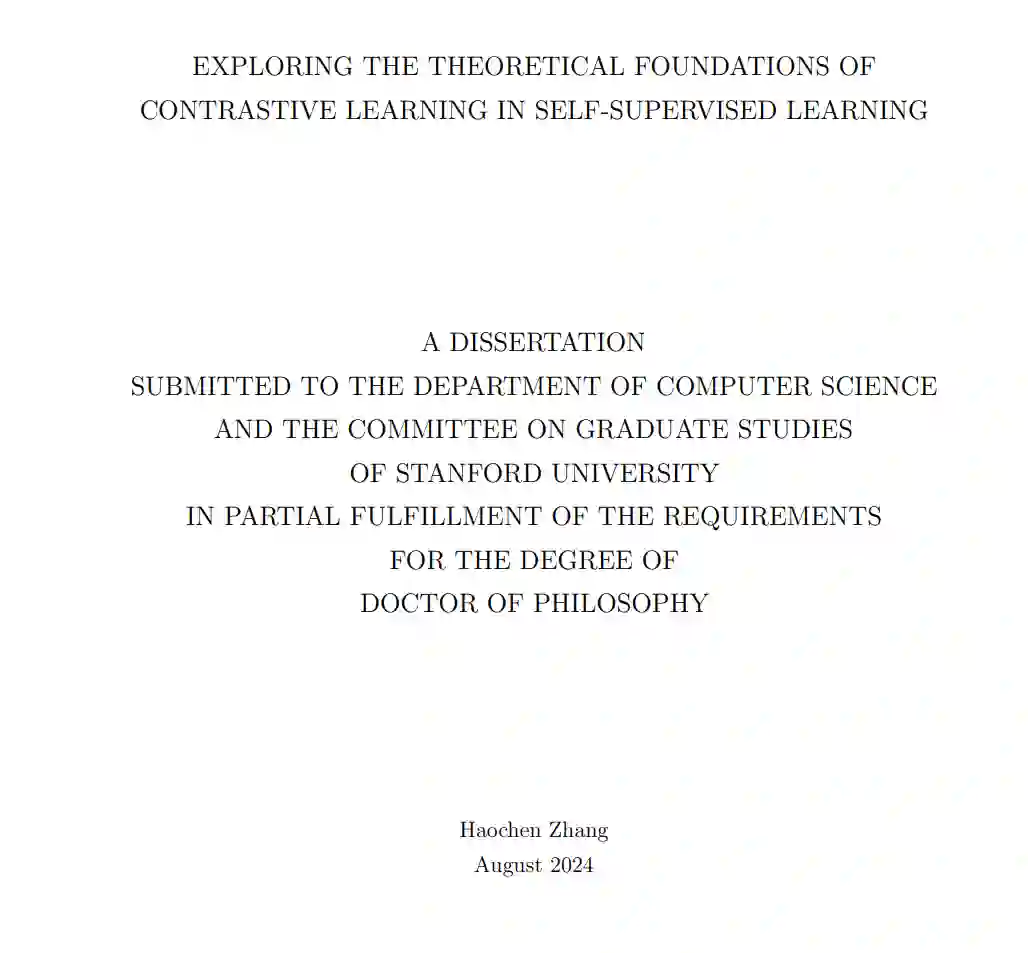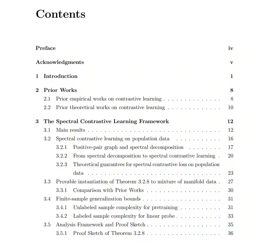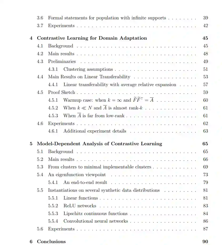 本论文的其余部分组织如下:第三章展示了我们的对比学习谱框架,包括群体层级损失的分析、有限样本泛化界限和实验证明。第四章将该框架扩展到领域自适应设置,正式刻画了对比表示的线性迁移性,引入了改进的线性评估方法,并展示了其实证有效性。第五章分析了归纳偏置在对比学习中的作用,引入了最小可实现聚类的概念,并在合成数据分布上实例化了理论,为架构约束提供了实证支持。最后,第六章总结了论文内容并讨论了未来的研究方向。