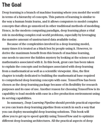 基于现代TensorFlow方法而不是过时的工程概念来构建自己的pipline。本书中展示了如何为现实的TensorFlow项目构建深度学习pipline。