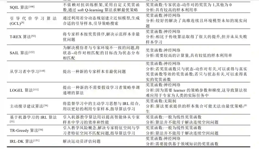 表 1 将对前 9 章提到的主要算法以表格形式分析比较,介绍算法相比之前算法的创新点,并分析算法的优缺点和关键特性,例如:奖赏函数的类型、奖赏函数的选择方式、基于模型算法(model-based)或无模型算法(model-free)、算法复杂度和样本利用率等.