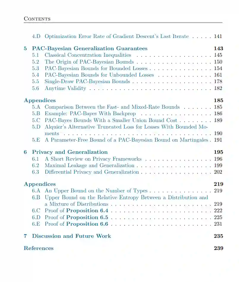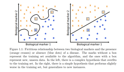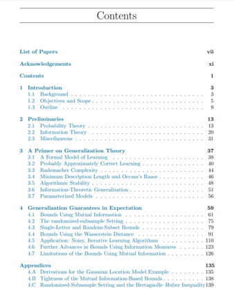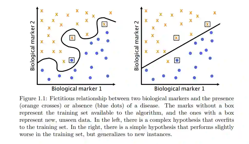 当前,机器学习在默默地塑造着我们周围的世界:从我们在社交媒体上看到的定制内容,到医疗、金融或自动驾驶等高风险行业【16-19】。机器学习算法被用来分析数据,用于早期疾病检测、防止欺诈或控制自动驾驶汽车的转向、制动和加速。因此,对于何时以及为什么这些算法在关键情况下能够适当地表现,拥有一个坚实的理论理解是至关重要的。 机器学习算法(或简称为学习算法)是一种机制,它观察问题实例的序列(通常被称为训练集)并返回针对该问题的假设。例如,给定一个包含两个生物标记和一个标签(标明一个人是否患有某种疾病)的医疗记录训练集,学习算法会返回一个模型,该模型从医疗记录中预测该疾病的存在。在这种情况下,假设是医疗记录与疾病存在之间的映射,这种映射由预测模型表征,如图1.1所示。算法返回的假设在训练集上可能表现得非常好。然而,这并不一定意味着它在新的、未见过的数据上也会表现良好。例如,考虑图1.1中的复杂假设,尽管它可以完美地解释医疗标记与疾病存在之间的关系,对于训练数据中的所有实例都是如此,但当它用来描述同一分布下的未见数据时就会失败。泛化理论领域专注于寻找数学保证,保证学习算法返回的假设在新的、未见过的数据上的性能。我们通常通过损失函数来描述算法的性能。在上述例子中,如果算法正确判断出一个人从其医疗记录中是否患病,则损失函数返回0,否则返回1。因此,损失函数的较小值意味着更好的性能。上述的泛化保证通常是对问题分布样本上损失函数期望值的上界形式,也称为人群风险。或者,保证以泛化误差的上界形式出现,泛化误差定义为人群风险与训练集实例上平均损失函数之差,或称为经验风险。在研究学习算法的泛化时,我们可能会考虑新数据来自相同分布(在分布内泛化)或接近但不同的分布(在分布外泛化)。例如,同一医院按照相同协议收集的同一人群统计的医疗记录可以被认为是来自同一分布。然而,来自不同人群统计的医疗记录通常被认为是来自不同的分布。例如,居住在高海拔城市的人的血氧水平低于居住在海平面的人。这种分布的变化通常被称为分布偏移。在本论文中,以及接下来的文本中,我们将仅关注在分布内泛化。泛化保证有两种主要类型: * 期望中的保证。这些保证是两者中较不具体的。它们确保算法返回的假设的平均性能永远不会小于某个量。 * 高概率保证。这些保证确保,以高概率,算法返回的假设的性能永远不会小于某个量。在信息论泛化的背景下,这种保证被称为PAC-Bayesian保证。研究学习算法泛化的经典方法侧重于算法考虑的假设类的复杂性。这指的是算法可以选择的可能假设的丰富性。这些方法背后的思想是,来自更复杂类的假设可以很好地适应训练集,但它们可能过度拟合,即它们可能适应它们观察到的特定数据的采样噪声,这可能与未来的实例不同。另一方面,来自更简单类的假设不能适应采样噪声,并需要关注数据中的高信号模式,代表数据分布。更简单类的缺点是它们缺乏丰富性,可能意味着它们的假设无法很好地描述训练集中的模式。然而,它们仍然具有小的泛化误差,它们在训练集中的表现不佳预示着在新的、未见过的数据上的表现也不佳。请参见图1.1,了解这种二分法的示例。像基于均匀收敛或Rademacher复杂性的经典方法的一个重要特征是,它们为算法考虑的整个假设类提供泛化保证。这可能太限制性了,因为在一个复杂的假设类中,仍可能有假设能够很好地泛化。脱离这种限制的一种方法是算法稳定性框架,它为稳定的算法提供泛化保证,即在呈现类似训练集时返回相似假设的算法。通过这种方式,算法稳定性可以保证考虑复杂假设的算法的泛化,只要它们在类似的训练集上一致地返回这些假设。通常,“类似训练集”的概念只考虑观察到的数据的每个可能值,无论多不可能,使得框架对某些情况过于限制性。最后,信息论泛化框架提供了针对算法和数据分布特定的保证。其思想是使用信息度量来捕捉算法返回的假设与训练集之间的依赖性。直观地说,假设对它看到的特定实例的依赖越多,它就越过度拟合,泛化性就越差。这种个性化的方法虽然更细致,但在之前的方法失败的情况下允许更强的理论结果。信息论泛化框架阐明了隐私和泛化之间的联系。如果算法返回的假设不泄露或不依赖于用于训练的实例的太多信息,那么算法是私密的。因此,算法越私密,算法返回的假设与训练集之间的依赖性就越小,它的泛化性就越好。