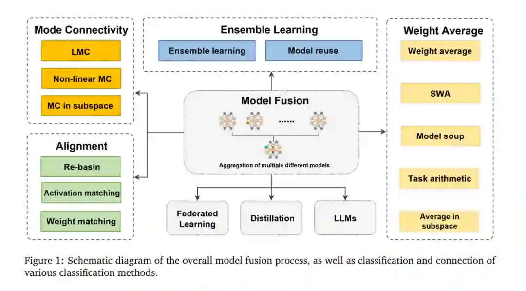 作为一项提高深度模型的准确性和鲁棒性的技术,模型融合促进了许多应用领域的改进。联邦学习,一种在中央服务器上聚合客户端模型的应用,使得各方可以贡献数据到功能的计算中(例如,各种统计、分类器),而无需泄露隐私。微调对预训练模型进行小的调整,结合模型融合以减少训练成本并适应特定任务或领域的需求。模型融合还涉及到“蒸馏”。即,将来自多个复杂模型的软目标知识结合起来,为特定要求训练一个小模型。模型融合在foundation/LLMs上的应用包括在大型基础模型或大型语言模型(LLMs)上的工作,例如视觉变压器(ViT)和GPT等。模型融合的应用帮助开发人员适应各种任务和领域的需求,并促进深度学习的发展。简而言之,我们的调查回顾了深度模型融合技术。在前三节“模式连接性”,“对齐”和“权重平均”中,我们主要从模型参数融合的角度进行全面研究。在“集成学习”中,我们主要从模型输出聚合的角度探讨了这个问题。