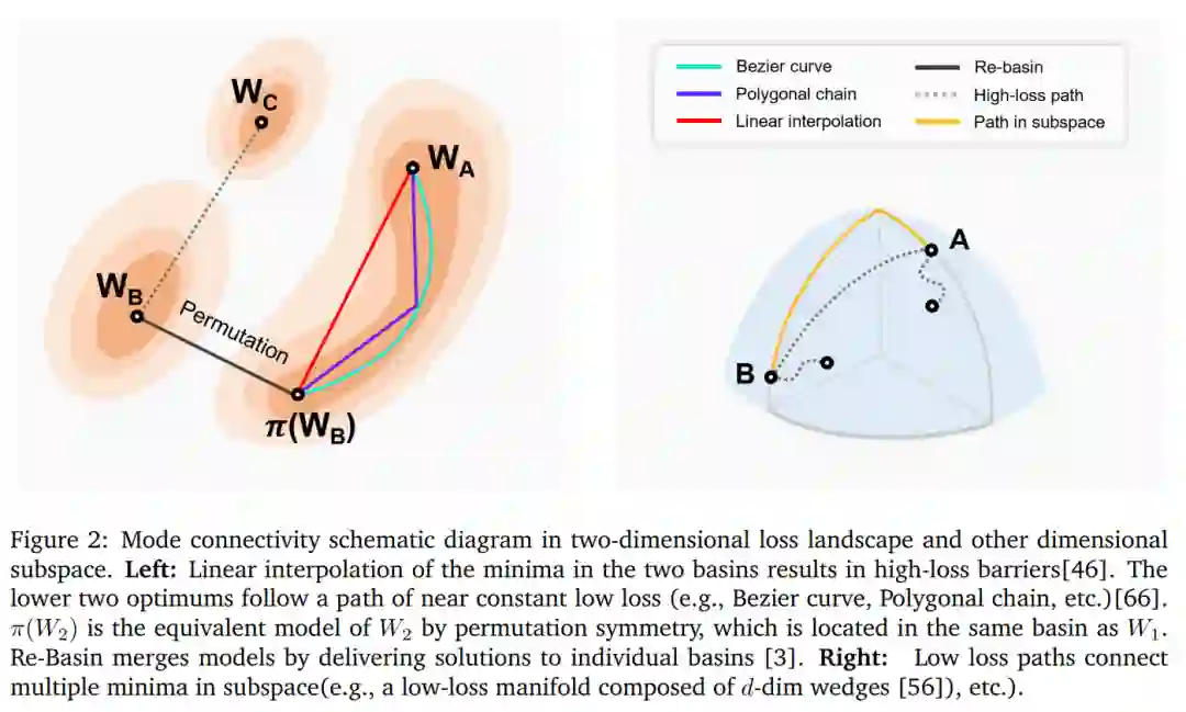 模式连接性指的是通过基于梯度的优化得到的解可以在权重空间中通过一条无障碍的路径(连接器)进行连接。我们可以沿着低损失路径获得更适合模型融合的其他模型。根据路径的数学形式和连接器所在的空间,我们将此部分划分为“线性模式连接性”,“非线性模式连接性”和“子空间中的模式连接性”。模式连接性可以在训练过程中解决局部优化问题。模式连接性的路径的几何关系也可以用来加速优化过程,如随机梯度下降(SGD)的收敛、稳定性和准确性。简而言之,模式连接性为解释和理解模型融合的行为提供了一个新的视角。但是,特别是在大数据集上训练模型时,应解决计算复杂性和参数调整的困难。