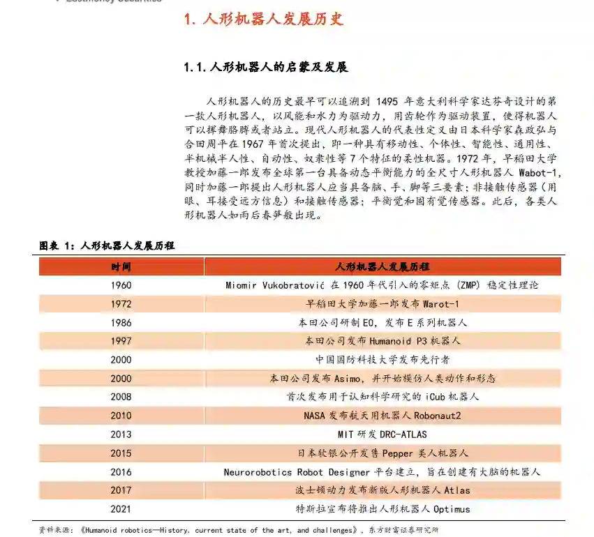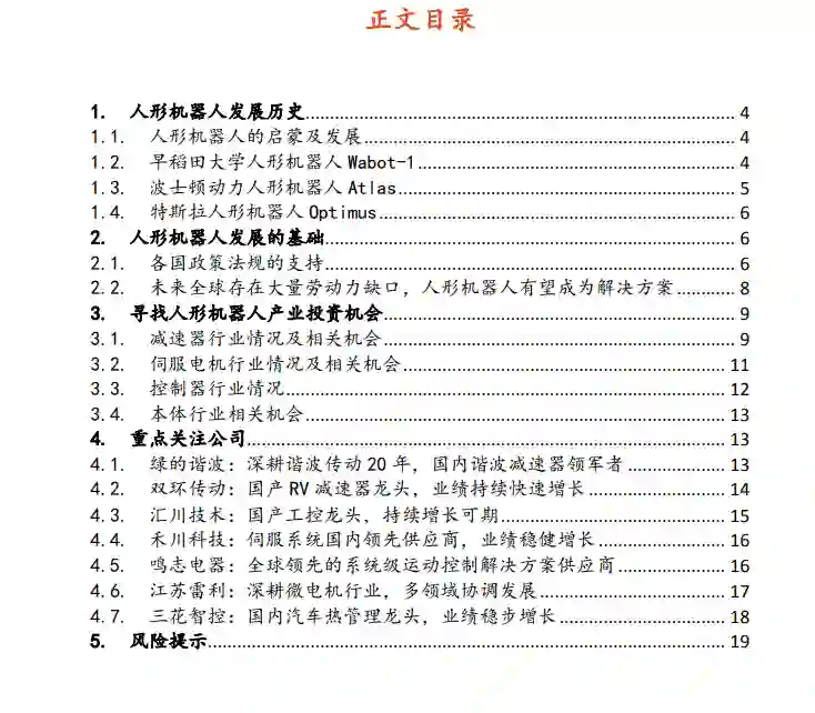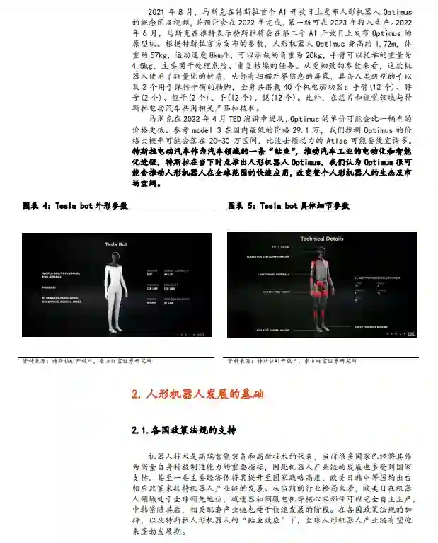 2021年8月,马斯克在特斯拉首个AI开放日上发布人形机器人的概念图及视频,并预计会在2022年完成,第一版可在2023年投入生产。Optimus将使用了轻量化的材质,头部有扫描外界信息的屏幕,具备人类级别的手以及2个用于保持平衡的轴脚,全身共搭载40个机电驱动器。我们推测Optimus的价格大概率可能会落在20-30万区间,这将有望推动人形机器人在全球范围的快速应用,改变整个人形机器人的生态及市场空间。 当前主要经济体对于机器人产业链的发展均保持支持态度,且有出台相关政策法规来扶持机器人产业链的发展。考虑到未来全球存在大量劳动力缺口,人形机器人有望成为解决方案。根据麦肯锡的报告显示,预计到2030年全球劳动力缺口在1亿人左右的水平,假设50%的缺口被人形机器人取代,结合特斯拉人形机器人在20-30万元的售价,仅劳动力类型的人形机器人市场空间就在10万亿元以上。且随着人形机器人智能化程度的提高,应用场景将会更加广泛,可能远不止我们预期的市场空间。 工业机器人最核心且成本最高的三个零部件分别是减速器、伺服电机、控制器,我们认为这三大块可能也是人形机器人产业链中机会最大的部分。另外,在本体结构件部分,特斯拉人形机器人倡导轻量化,以往做汽车铝合金压铸件的企业可能也会存在较多机会;在电池部分,工业机器人多使用铅酸蓄电池或镍氢电池,人形机器人出于对运动性的考量,会使用到锂电池,我们认为锂电池热管理部分也将会有很大机会。