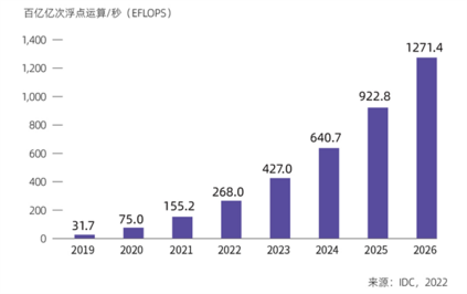 IDC预测,中国智能算力规模将持续高速增长,预计到2026年中国智能算力规模将达到1271.4EFLOPS,未来五年复合增长率达52.3%,同期通用算力规模的复合增长率为18.5%。 02