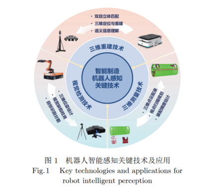 视觉感知是机器人系统的重要组成部分, 在复 杂的三维工业场景中利用视觉传感器获取周围环境 的真实空间信息, 并进行预处理、配准融合以及空 间场景表面生成等过程, 实现对外界环境真实的刻 画及数字模型的重建, 为机器人在工业制造中提供 丰富的二维和三维信息. 智能制造机器人通过视觉 等感知系统, 具备了实时观察作业场景的能力, 可 以极大地增强其智能化程度, 如图 1 所示. 本节将 对双目三维环境感知、3D 点云配准、位姿估计等技 术进行介绍.