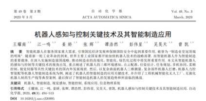 近年来, 智能机器人作为国民经济与社会发展 的基础性与战略性产品, 在服务国家航空航天、轨 道交通、海洋舰船、工程机械制造等领域重大需求, 引领国民经济发展和保障国防安全中起到重要作 用, 被誉为 “制造业皇冠顶端的明珠”. 随着新一轮 工业革命的到来以及人工智能、云计算、物联网等 技术快速发展, 机器人技术受到美国、欧盟等世界 发达国家的高度重视, 同时世界主要工业国家都开 始加快机器人部署的步伐. 2013 年, 德国率先提出 “工业 4.0”, 旨在推动工业现代化和数字化转型, 在 新一轮工业革命中占领先机; 2017 年, 美国推出 “国家机器人计划 2.0”, 强调机器人可扩展性, 通过 多机器人协作实现复杂环境下分布式的感知、规划、 行动和学习, 提升机器人的作业范围. 2020 年美国 发布的 “机器人发展路线图”以及 2021 年发布的 “无尽前沿法案”, 均将机器人与先进制造技术列为 发展重点; 而欧盟早在其 “火花计划”、 “地平线 2020”等计划, 以及日本发布的 “机器人新战略”, 都着重强调了机器人的作业能力; 此外, 我国的 “智能制造 2025”等, 也明确了机器人在推动制造业 智能化转型升级中将发挥重要作用[1−3] . 机器人感知与控制是实现机器人智能化作业的 关键核心技术. 机器人需要感知周围环境和识别作 业对象, 从二维到多维信息的感知和融合, 实现快 速、精准的环境感知和目标识别, 充当机器人系统 “眼睛”. 感知环境之后, 结合智能规划决策和自适 应控制等方法, 像 “大脑”一样为机器人系统提供最 恰当的控制命令, 以使得机器人做出相应的动作和 反应. 近年来, 随着深度学习, 大数据, 智能控制等 技术的快速发展, 机器人的智能感知与自主作业的 水平也在迅速提升. 如 DeepMind 开发的 AlphaGo, 可以让机器人在不断的游戏中自我学习与提高, 从 而实现更加智能的决策与控制; 特斯拉的人形机器 人, 其搭载了激光雷达、摄像头、超声波传感器等, 用于感知周围环境和避开障碍物, 还配备了一个自 主学习系统, 可以不断学习和改进自己的行为和决 策, 从而更好地适应不同的任务和场景; 波士顿动 力的 Spot 机器狗, 可以与人类进行互动, 如识别和 追踪人类, 并在人类的指示下执行指定任务如检查 和搬运物体. 当前, 云计算、物联网和大数据等新兴信息通 信技术快速发展, 为机器人的高端制造应用提供了 新的思路和发展契机, 数字化、网络化、智能化融合 创新引领未来工业发展已取得广泛共识. 我国在 《十四五规划和 2035 年远景目标纲要》 也明确提出 要 “加快推进制造强国、质量强国建设, 深入实施 智能制造和绿色制造工程, 发展服务型制造新模式, 推动制造业高端化智能化绿色化”. 而传统的人工 以及专机加工, 加工质量一致性差、效率低且只能 实现小批量生产, 已无法满足智能制造需求. 区别 于传统工业机器人简单、重复性劳动, 高端制造机 器人是更信息化、网络化、智能化、柔性化的机器人[4] . 在智能工厂中, 机器人的作业环境日益非结构化, 作业工序趋于柔性化, 作业对象日趋定制化, 生产 的动态性对机器人的环境感知与控制技术提出了越 来越高的要求. 在未来的智能工厂中, 变批量、多品 种、定制化、高柔性的生产模式将成为主流, 机器人 也将得到更加广泛的应用, 机器人感知与控制技术 为智能工厂的高适应、高精度、智能化作业提供保障.