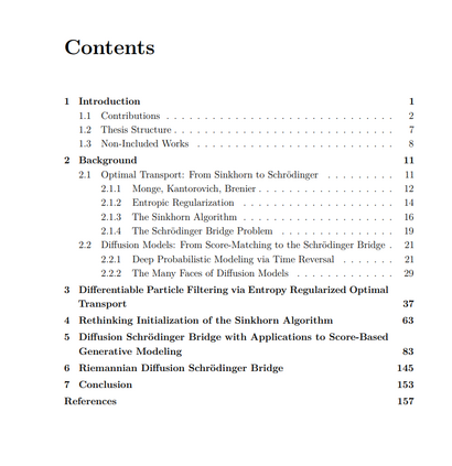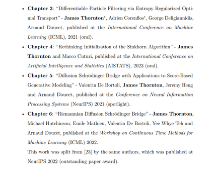 深度概率模型在高维、多模态数据合成和密度估计任务中已成为最新的技术前沿。通过将抽象的概率公式与神经网络的表达能力和可扩展性相结合,深度概率模型已成为机器学习工具箱中的基本组成部分。然而,这些模型仍然存在一些局限性。例如,深度概率模型通常局限于基于梯度的训练,因此难以结合非可微操作;它们的训练和采样成本较高;并且深度概率模型往往没有利用先验的几何和特定问题的结构知识。 本论文由四部分研究工作组成,通过基于最优传输的仿真方法推动深度概率模型领域的发展。首先,使用Sinkhorn算法的正则化最优传输,我们提供了一个理论上有依据且可微的粒子滤波中重新采样的近似方法。这使得人们能够通过端到端可微粒子滤波对状态空间模型(一类序列概率模型)进行基于梯度的训练。接下来,我们探讨了Sinkhorn算法的初始化策略以解决速度问题。我们展示了精心的初始化可以显著加速Sinkhorn算法。这在可微排序、变分自编码器潜在空间中的聚类以及粒子滤波中都有应用。 剩下的两项工作通过薛定谔桥对基于扩散的生成模型领域作出了贡献。首先,我们将扩散模型与薛定谔桥联系起来,称之为扩散薛定谔桥。这一方法论实现了加速采样、数据到数据的仿真以及一种计算高维连续状态空间问题的正则化最优传输的新方法。最后,我们将扩散薛定谔桥扩展到黎曼流形设置。这使得人们能够结合先验的几何知识,从而实现对黎曼流形值数据的扩散模型的更高效的训练和推理。这在气候和地球科学中有应用。 观察到的现象通常具有高维度、分布上多模态,并且来自于尚未完全理解的随机复杂系统。科学家的职责是更好地理解我们周围物理和社会世界中的这些观察现象。对统计机器学习研究人员特别感兴趣的是开发数据驱动的模型来模拟和预测感兴趣的随机量及其相互作用。此类数据驱动的机器学习方法通常包括利用大型数据集和富有表现力的模型参数化来弥合领域知识与经验证据之间的差距。 随着技术的进步,我们现在能够捕获、存储和访问大量且不断增加的数据。结合现代计算资源,广大数据可用于从业者训练大型且灵活的神经网络参数化模型。富有表现力的神经网络与理论上有依据的统计方法之间的协同作用,提供了一种原则性的、可扩展的方式来准确表示感兴趣的随机量之间复杂关系。深度概率模型正位于此交汇点,并已成功应用于多个领域,包括:视觉和语言的经典机器学习任务;时间序列、预测或密度估计的统计推断问题;以及自然科学应用。尽管进展迅速,但仍有许多未解决的挑战。深度概率模型在训练和部署方面都资源昂贵。如何高效地训练和模拟概率模型尚不明确,尤其是对于迭代扩散模型。也不总是清楚如何将现有的特定问题知识或结构融入深度概率模型中。从直观和实验上来看,结合现有知识可以开发出更有效的损失目标和更高效的模型,从而减少学习高性能模型所需的数据量和参数量。最终,结合领域知识可以减少神经网络需要通过从数据中学习来弥合的差距。在将涉及非可微操作(如排序、聚类或重采样)的理论上有依据的统计方法与通常限于基于梯度训练的深度网络的表现力相结合方面,也存在许多挑战。 本论文通过引入基于最优传输和仿真方法的新方法,对深度概率模型的发展作出了贡献。 贡献