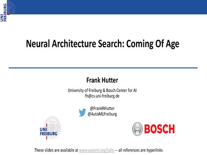 神经架构搜索(NAS)是一个很有前途的领域。首先,我将讨论围绕NAS建立科学社区的各种工作,包括基准测试、最佳实践和开放源码框架。然后,我将讨论该领域几个令人兴奋的方向:(1)广泛的NAS加速技术;(2)在Auto-PyTorch中结合NAS +超参数优化,实现现成的AutoML;(3)神经集成搜索(NES)的扩展问题定义,它搜索一组互补的架构,而不是像NAS中搜索的单一架构。