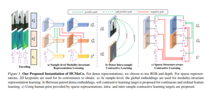 以人为中心的感知在视觉和图形学中起着至关重要的作用。但是他们的数据注释非常昂贵。因此,希望有一个通用的预训练模型,作为数据高效的下游任务转移的基础。为此,我们提出了以人为中心的多模态对比学习框架HCMoCo,该框架利用人类数据的多模态特性(如RGB、深度、2D关键点)来进行有效的表示学习。该目标面临两个主要挑战: 多模态数据的密集预训练,稀疏人类先验的有效利用。**为了解决这一问题,我们设计了一种新型的密集样本内对比学习和稀疏结构感知对比学习目标,通过层次化学习具有连续和有序特征分布和结构感知语义一致性的模态不变潜空间。**HCMoCo通过组合异构数据集为不同的模态提供预训练,这允许有效地使用现有的特定于任务的人类数据。在四个不同模式的下游任务上的大量实验证明了HCMoCo的有效性,特别是在数据效率设置下(DensePose Estimation和Human Parsing提高了7.16%和12%)。此外,通过探索跨模态监督和缺失模态推理,我们证明了HCMoCo的多功能性,验证了它在跨模态联想和推理方面的强大能力。