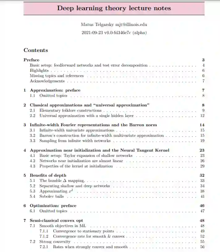 深度学习的研究在许多机器学习任务上产生了最先进的结果。大多数的进步都是由直觉和通过试验和错误进行的大规模探索推动的。因此,目前理论落后于实践。ML社区并不完全理解为什么最好的方法是有效的。来自UIUC Matus Telgarsky教授撰写了关于深度学习理论笔记,值得关注。