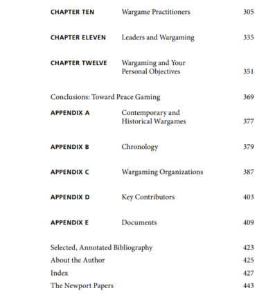 结论以简短的回顾开始,然后问道:我们希望兵棋在未来如何发展?然后,提出了一种兵棋发展方式,即从帮助赢得战争的工具发展到帮助首先避免战争的工具。该书最后说明了兵棋推演的作为避免战争工具的用途,以帮助实现最高形式的胜利--公正和持久的和平。